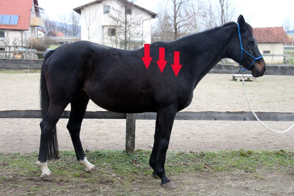 As mentioned, a lot of horses tend to have their spines locked toward extension. This usually happens when the base of the neck (the junction between the neck and thoracic vertebrae), is pushed down. The orientation of the spine becomes steeper, moving away from neutral, robbing the horse of his full range of motion. Why does the base of the neck get pushed down? There are many reasons for this, ranging from poll tightness, to bad riding to poor hoof-care, but what they all have in common is a weak thoracic sling. In order to achieve a neutral spine, we need to first address factors that might be preventing the horse from using these muscles correctly and then start training the thoracic sling. This can be a long process, but it is an investment in your horse's health well worth making.