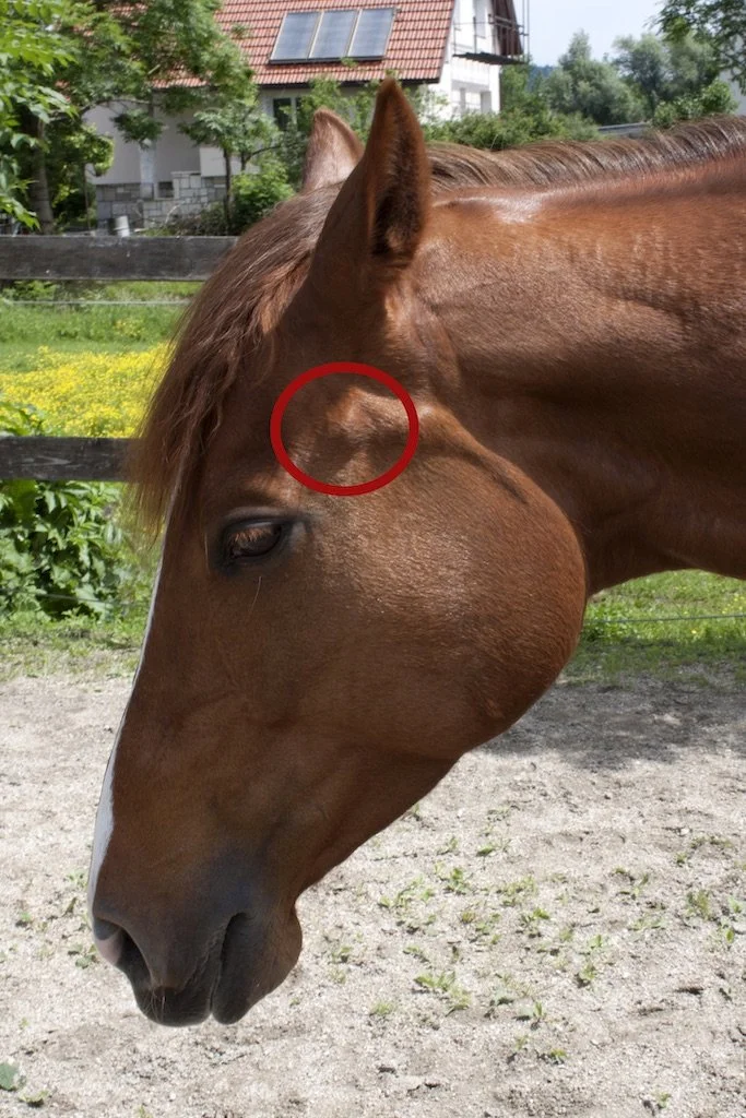 An uneven development of the temporal muscles can be an indicator of TMJ dysfunction. If you notice this, make sure to consult your equine dentist as well.